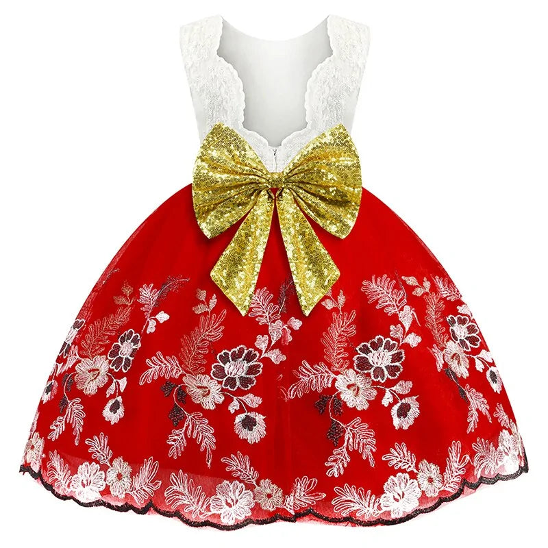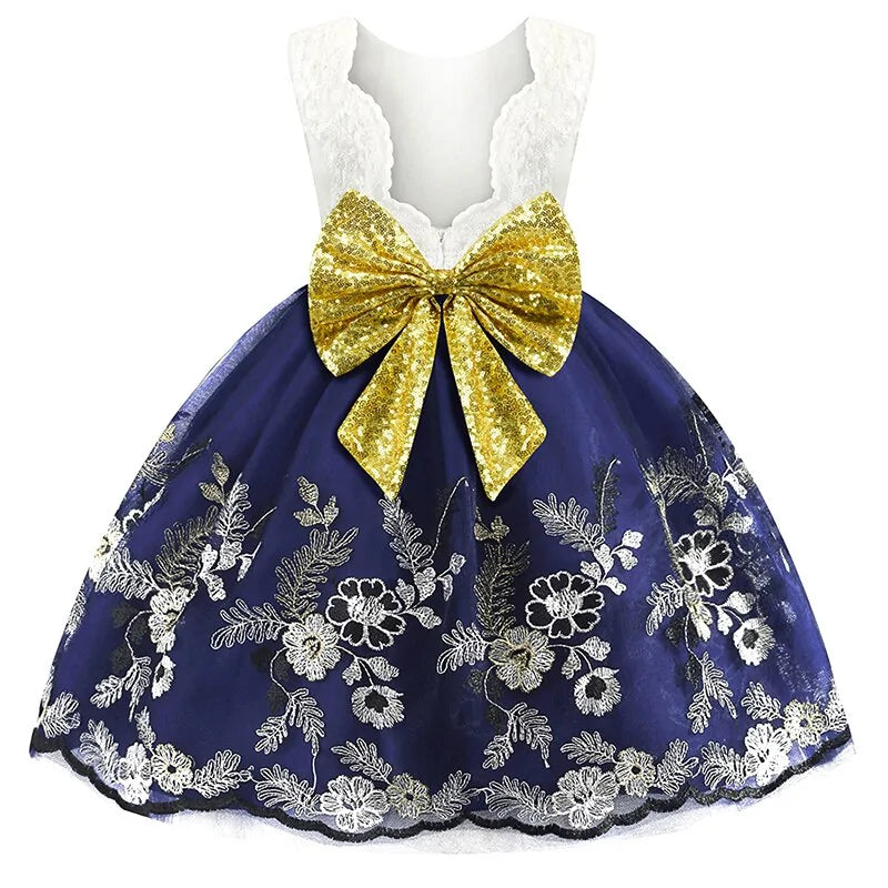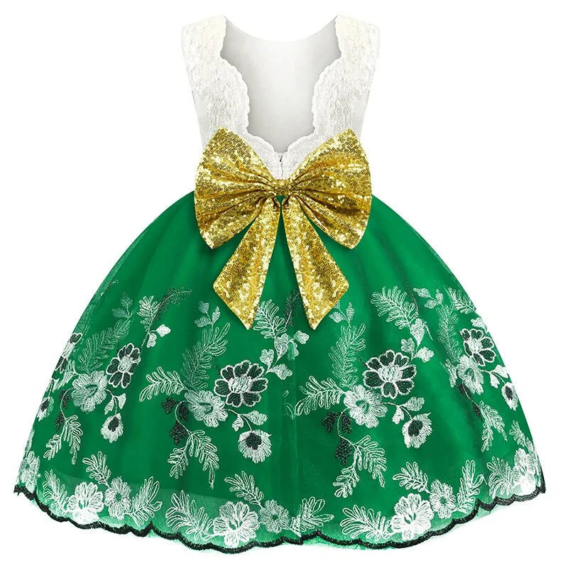 Designed for comfort and flair, this dress boasts a perfect fit for your little one, ensuring they shine effortlessly at any occasion. Adorned with intricate floral patchwork decorations, every detail adds to its magical allure. The silhouette is elegantly ball-shaped, ideal for twirling and dancing the day away.